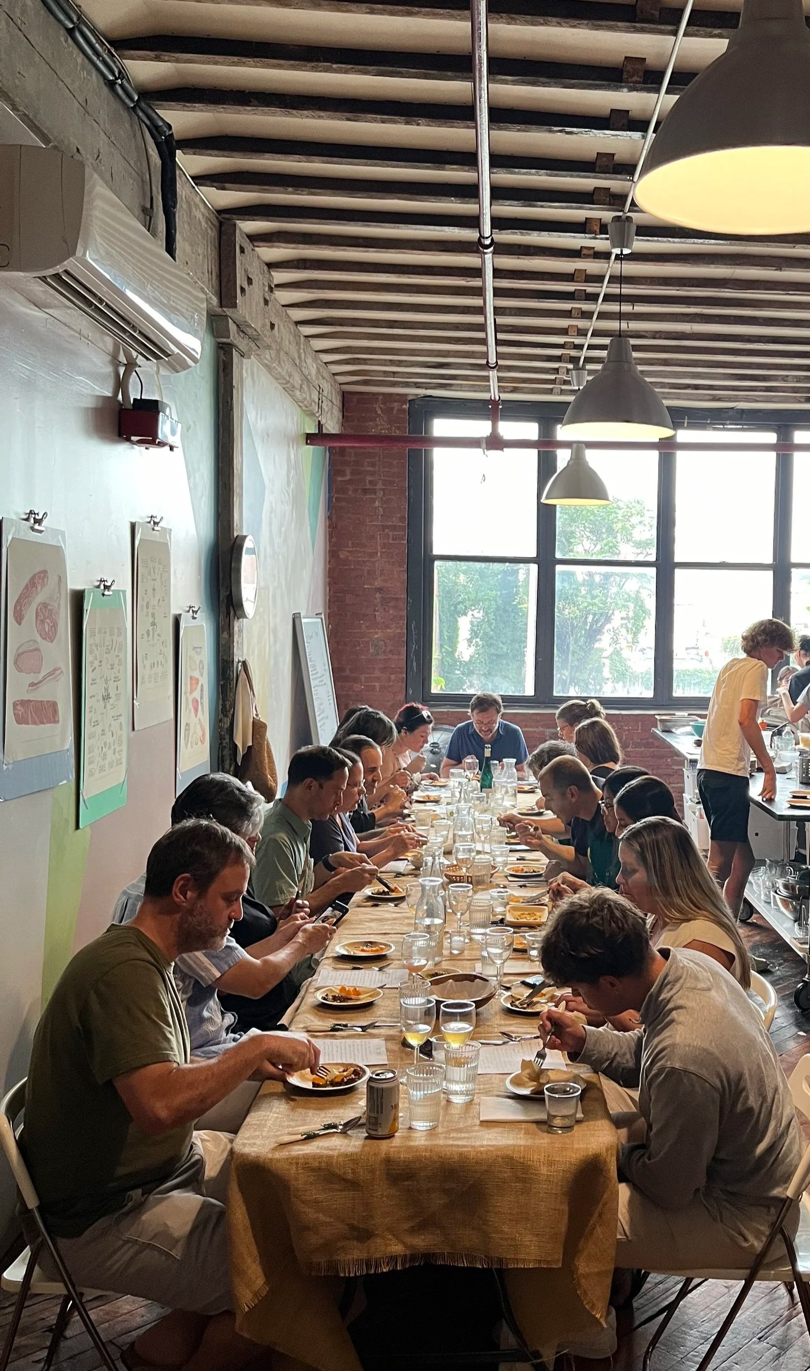 Our studios are in the heart of wonderfully diverse Sunset Park, just south of Industry City, in a converted old box factory near the waterfront, with 16-inch wide old factory beams, original brick walls, 14- foot ceilings, and huge windows that flood the space with natural light and offer an industrial cityscape view. The Chef’s Studio is where cooking happens and where guests and chefs interact. The Parlor is where we host most of our performances, as well as pour cocktails, play music, and serve smaller, seated meals.